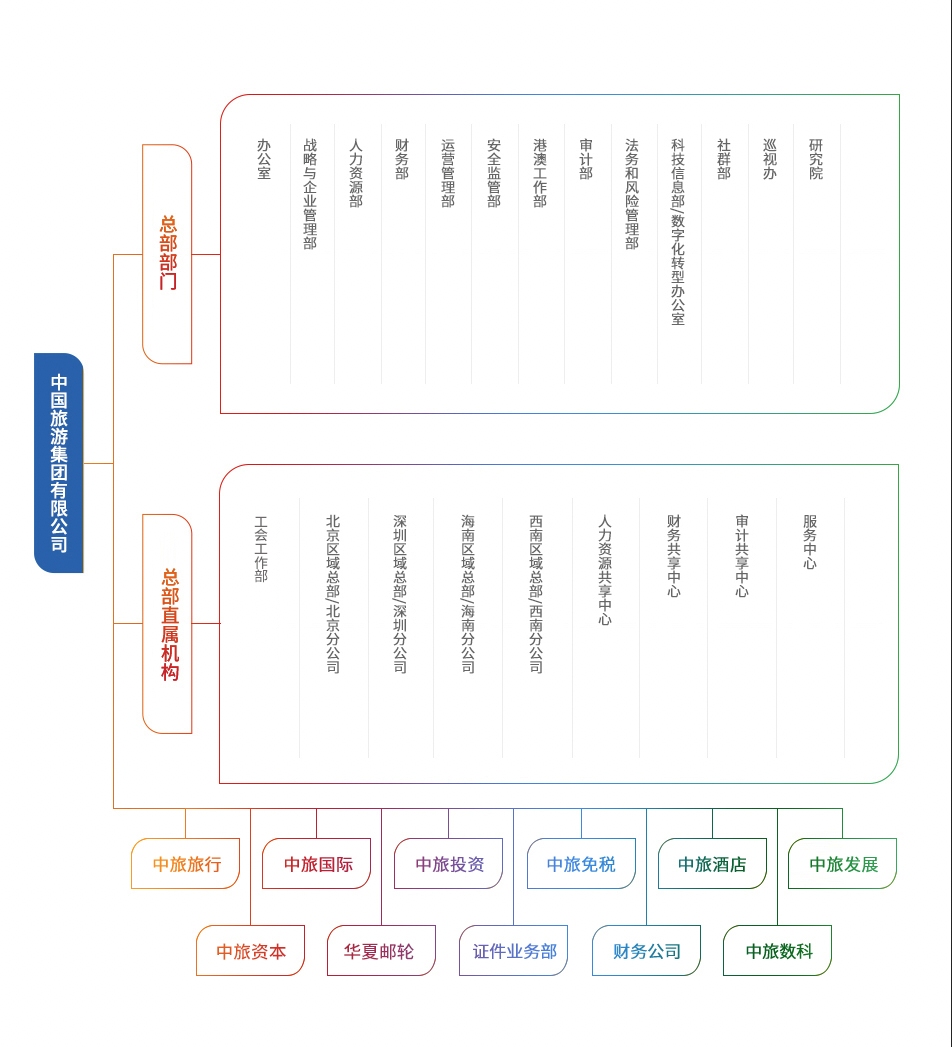 中國旅游集團有限公司暨香港中旅(集團)有限公司是中央直接管理的國有重要骨干企業(yè),也是總部在香港的中央企業(yè)之一。集團歷史可追溯到1923年8月15日上海商業(yè)儲蓄銀行設(shè)立的旅行部。經(jīng)過百余年的發(fā)展,集團形成了由旅行社、景區(qū)、酒店、免稅、旅游交通、證件業(yè)務(wù)、郵輪、地產(chǎn)、文創(chuàng)以及在港綜合業(yè)務(wù)組成的產(chǎn)業(yè)布局,經(jīng)營網(wǎng)絡(luò)遍布內(nèi)地、港澳和海外超過30個國家和地區(qū)。集團旗下匯聚了港中旅、國旅、中旅、中免等眾多知名旅游品牌,是我國唯一一家以旅游為主業(yè)的央企,也是目前我國發(fā)展歷史最長、產(chǎn)業(yè)鏈條較全、經(jīng)營規(guī)模較大、品牌價值較高的旅游龍頭企業(yè)。截至2025年底,集團員工人數(shù)超過4.2萬人,集團總資產(chǎn)超過2000億元,每年接待游客近9千萬人次。目前,集團旅游主業(yè)的基本情況如下: