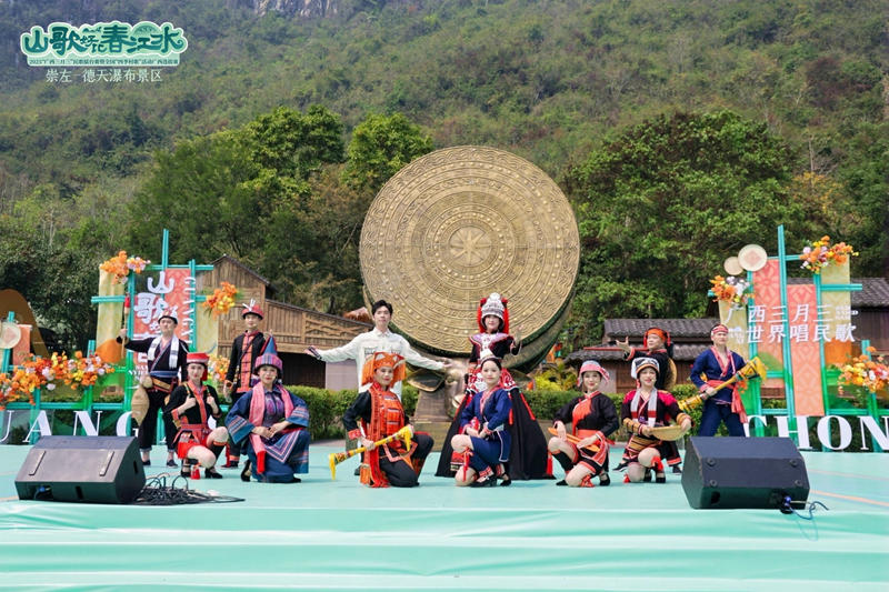 3月26日,2025“廣西三月三”民歌擂臺賽暨全國“四季村歌”活動廣西選拔賽及“壯錦國潮首發(fā)季·2025春夏新品發(fā)布會”在中旅國際所屬廣西德天跨國瀑布景區(qū)舉辦。來自全區(qū)的15支代表隊(duì),依托以銅鼓廣場等景區(qū)地標(biāo)為背景的山水舞臺與越南歌手隔河對唱,結(jié)合中越民族表演和精美的壯錦非遺作品,為游客獻(xiàn)上一場沉浸式文化盛宴。