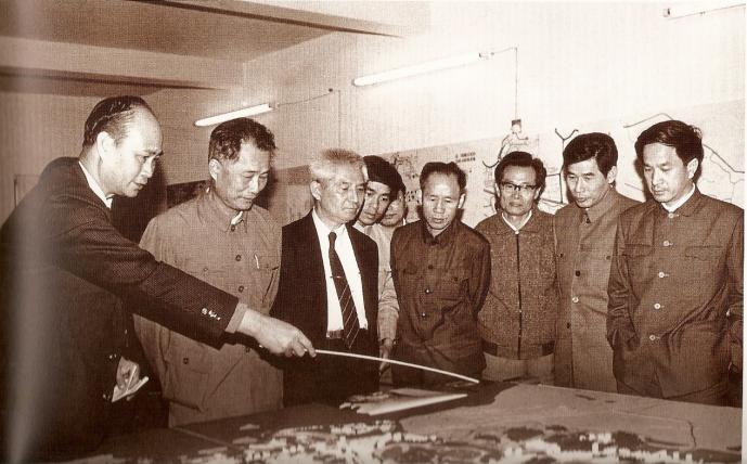 馬志民(左一)向時任中共中央委員、廣東省委書記林若(左二)介紹華僑城開發規劃