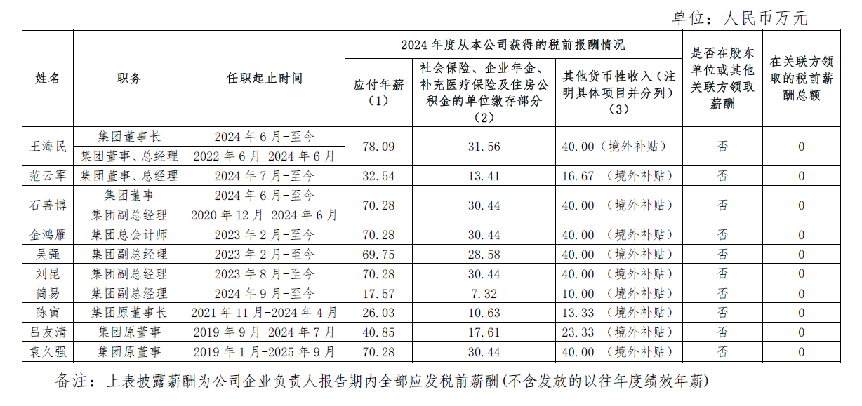 中國旅游集團有限公司企業負責人2024年度薪酬情況