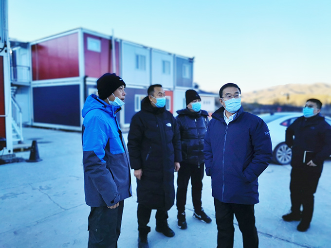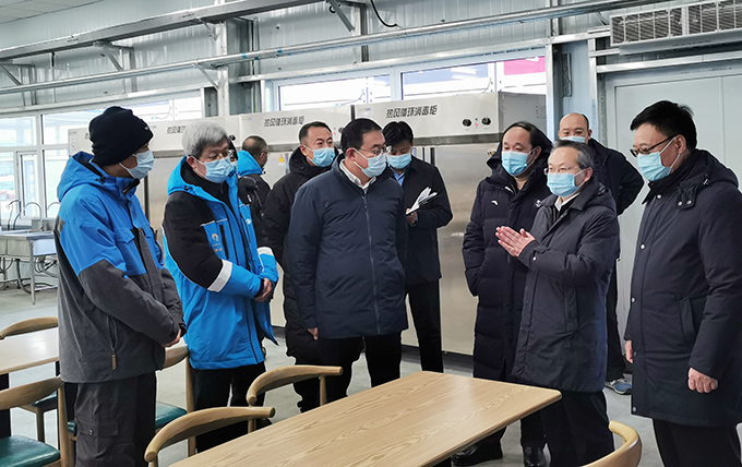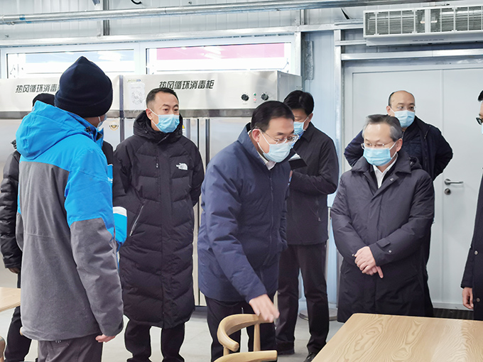 在中旅酒店冬奧項目組后勤保障組及餐飲組負責人的陪同下,嚴鵬程副省長及賈凱副部長視察了駐地環境、員工餐廳、員工宿舍及急救應急配套設施。后勤保障組負責人就駐地選址、建設和功能配置情況進行了綜合匯報,詳細介紹了團隊駐地關于紅綠區防疫管控要求的落實情況。