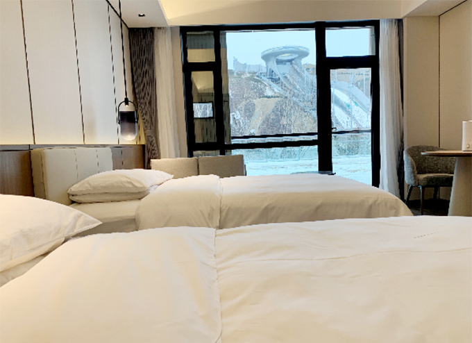 酒店位于古楊樹場館群內(nèi),近鄰國家跳臺滑雪中心和國家越野滑雪中心。部分客房的窗外,能夠看到“雪如意”鑲嵌于山間,更能欣賞到夜色下“雪如意”的星光璀璨。冬奧會開幕時,這里將與南側(cè)的雪如意維景酒店共同迎來雪上項目的技術(shù)官員團隊,因此,酒店的工作團隊,正以與冬奧項目服務(wù)團隊同樣的快節(jié)奏、高標準來推進各項工作。據(jù)悉,為做好本次測試賽服務(wù),酒店團隊從酒店籌開、到測試賽服務(wù)籌備,迅速集結(jié)、快速整合,形成了一支全新的中旅服務(wù)勁旅,成為了“冰玉環(huán)”邊一道亮麗而溫馨的風景。