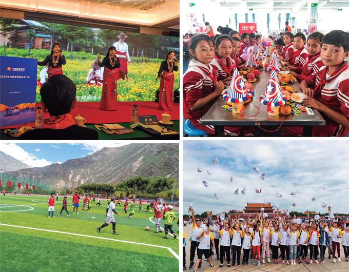 圖1-4:2020德欽縣梅里雪山推介會;「星旅家庭成長計劃」公益項目,為孩子們打造學習生活空間;集團幫扶的德欽三小操場;中國旅游集團希望之星成長營