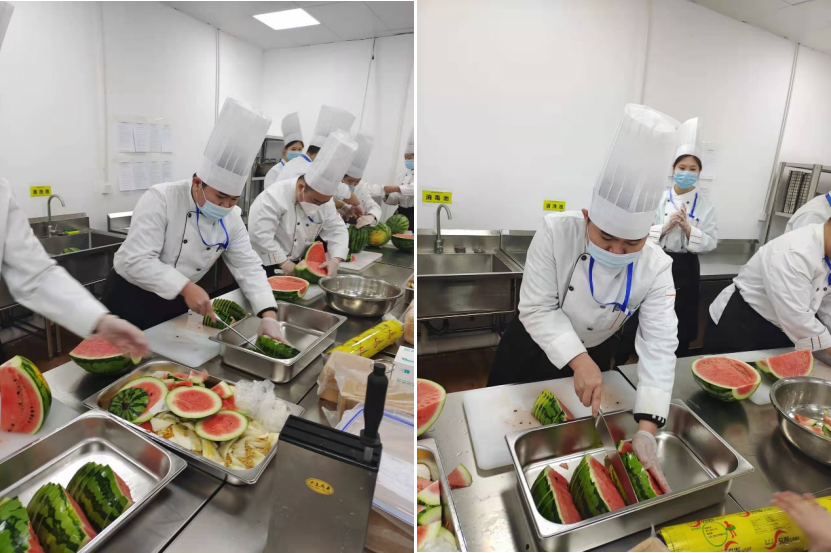 隨著冬奧會的臨近,人員也陸續到崗,除了李進曉和另一位骨干是熟手外,其余的2名基層員工、16名實習生都是沒什么經驗的,這時候前期寫的菜單說明就派上了用場。為了讓大家盡快熟悉菜品的制作,培訓成了每天的常態工作。李師傅又開始對員工進行一次次的培訓。從食材的選擇到調料的配比,從加工制作的方法到最終出品的要求,每個環節、每個要點都耐心講解,遇到培訓學員不甚明白的也是不厭其煩的解釋。為了檢驗學員的成果,李進曉會隨時“考試”,拿起一個器皿就問“這是干什么用的?”又或者提一個汁醬名就問“需要什么材料?”“什么配比?”再或者說一個水果就問“上原果還是要切配?”“怎么清洗?”“消毒水是什么配比?”“怎么切?”如此反復,學員就會繃緊弦,認真的記,反復的操練,直到達到要求為止。他的理念是:做菜馬虎不得,為冬奧做菜更是玩不得半點虛的,一定要付出最大的責任心,飽含熱愛,才能讓客人在品嘗美味同時,感受被重視的幸福感,這樣做出來的菜品才是成功的。