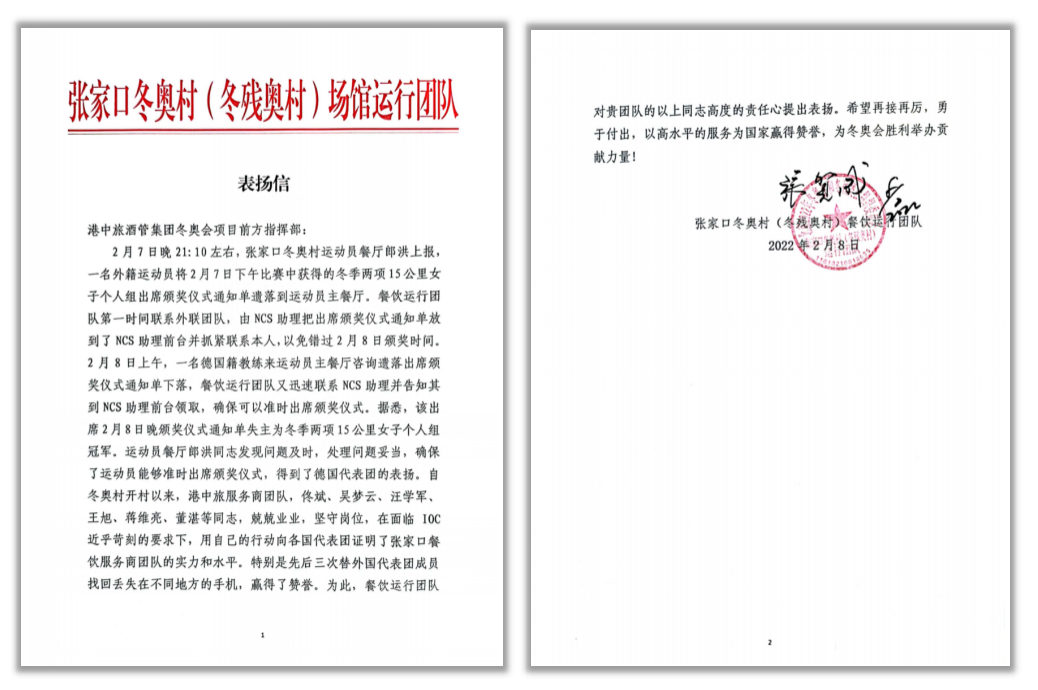 2月8日,北京奧組委張家口冬奧村運行團隊向中旅服務團隊專致感謝信,這也是團隊收到的第二封紅頭感謝信。