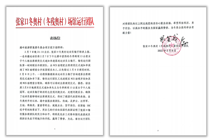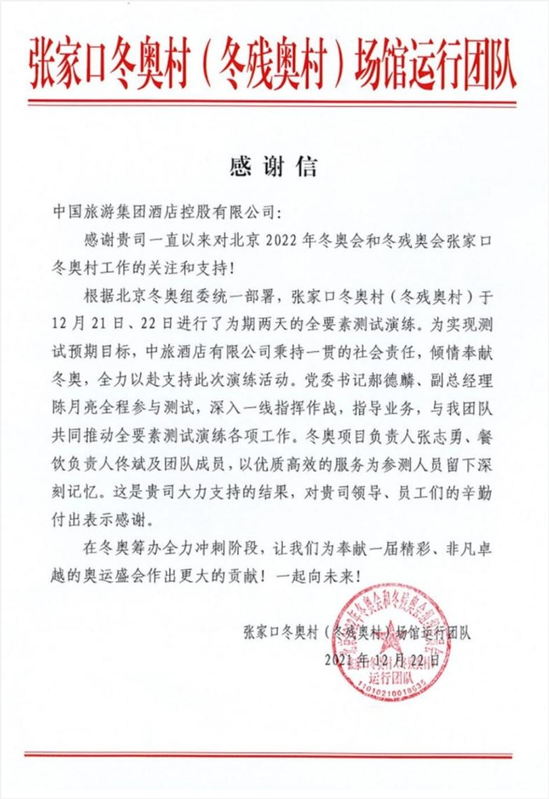 北京奧組委張家口冬奧村運(yùn)行團(tuán)隊(duì)先后向中旅冬奧服務(wù)團(tuán)隊(duì)專致感謝信,對中旅團(tuán)隊(duì)急人所急、主動作為的奉獻(xiàn)精神和兢兢業(yè)業(yè)、堅(jiān)守崗位的敬業(yè)精神提出表揚(yáng),以多個真人真事概括了冬奧村開村以來的“中旅冬奧服務(wù)故事”,同時,信中點(diǎn)名表揚(yáng)了多位中旅服務(wù)人員。