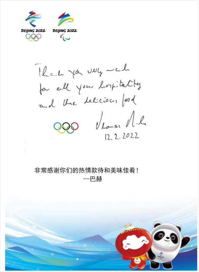 集團(tuán)中旅酒店高質(zhì)量高標(biāo)準(zhǔn)提供住宿餐飲服務(wù)、接待服務(wù),全力以赴做好各項(xiàng)服務(wù)保障工作,受到國際奧委會多次贊揚(yáng)。國際奧委會主席巴赫在張家口冬奧村運(yùn)動員餐廳就餐后,特別留言點(diǎn)贊張家口冬奧村的餐飲服務(wù),寫道:“非常感謝你們的熱情服務(wù)和美味佳肴”。國際奧委會北京冬奧會協(xié)調(diào)委員會主席胡安·安東尼奧·薩馬蘭奇“微服私訪”張家口冬奧村運(yùn)動員餐廳,經(jīng)過手消、選餐、取餐、用餐等一系列流程的親身體驗(yàn),他對張家口冬奧村的餐飲服務(wù)贊不絕口,并專門手寫感謝留言。