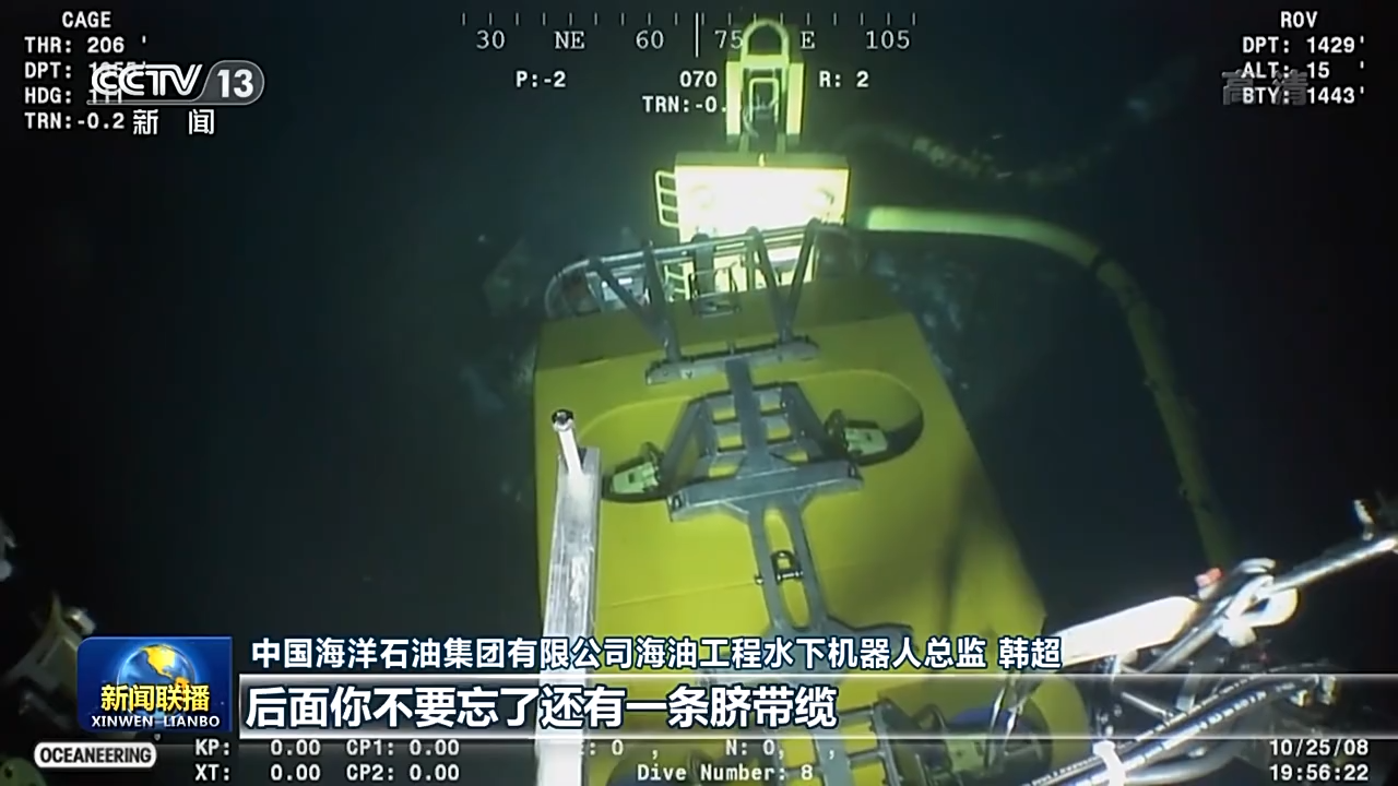 中國海洋石油集團(tuán)有限公司海油工程水下機(jī)器人總監(jiān) 韓超:你的手腳要并用,然后你要在抓的同時(shí),后面你不要忘了還有一條臍帶纜是連著你的。你再稍微一用力,那通訊要不然斷了,要不然就絕緣報(bào)警。
